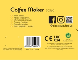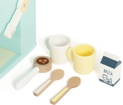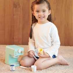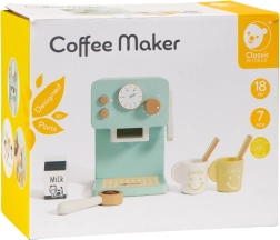 Sættet indeholder alt, hvad børn behøver for at servere “kaffe”: kaffemaskine, 2 kopper, 2 skeer, “mælk” og en stamper/måleske til kaffe. Legen understøtter finmotorik, hånd-øje-koordination og social interaktion.