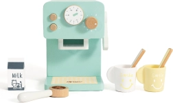 Giv små baristaer en autentisk oplevelse af kaffebrygning. Denne trækaffemaskine i turkis design virker realistisk takket være håndtagsstyring og en drejeknap med mekanisk lyd. Omhyggelig forarbejdning uden skarpe kanter og naturligt træ af høj kvalitet sikrer holdbarhed og sikkerhed.