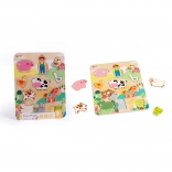 Takket være den robuste trækonstruktion og de glatte kanter er puslespillet sikkert og behageligt at røre ved. 12 dele giver den rette mængde udfordring for tumlinger og byder på masser af gentagen fornøjelse. Den farverige plade med en malerisk gård indbyder til leg og udvikler både fantasi og ordforråd.