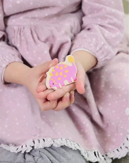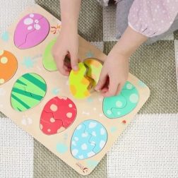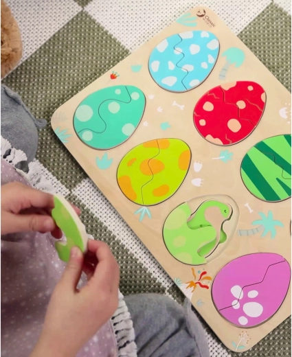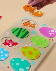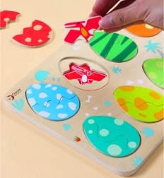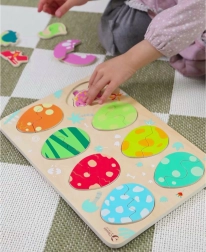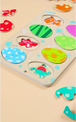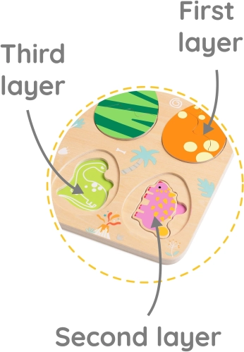 Dette kvalitets-træpuslespil kombinerer leg og læring. Takket være tre lag kan børn gradvist afdække dinosauræg, finde søde dinosaurer under dem og på det nederste lag lede efter vejledende illustrationer. De livlige farver og trygt bearbejdede brikker indbyder til gentagen leg.