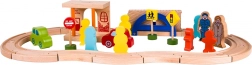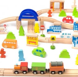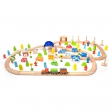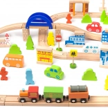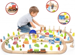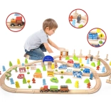 Dette omfattende togsæt tilbyder alt til at bygge en levende lille by: lokomotiv med to vogne, biler, træer, skilte, figurer og en blå viadukt. Takket være de mange skinner kan børn nemt lægge forskellige baner og skabe en ny historie hver dag.