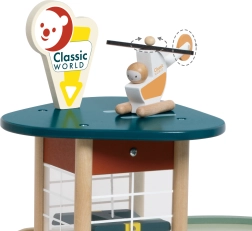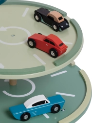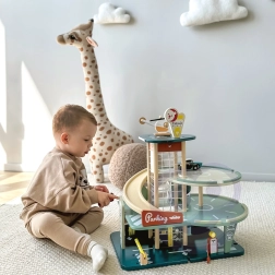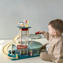 Oplev retrocharme fra bilernes guldalder. Dette fleretagers træparkeringshus giver gnidningsfri trafik på alle niveauer – børn hejser bilerne med elevatorskakt, kører ned ad spiralramper, besøger vaskehallen og pumpen og lander på tagets helipad. Den robuste trækonstruktion med glatte kanter er sikker og behagelig at røre ved.