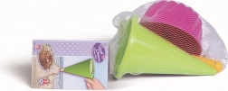 3-delt sandkassesæt fra Androni til de mindste i kvalitetsplast, fremstillet i Italien. Indeholder en dekorations- og blandetragt til blanding af sand og vand og til at lave kreative muffins og sandkager, en kageform og en isske til kugler. Let, sikkert og egnet fra 10 måneder.