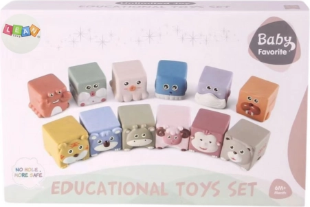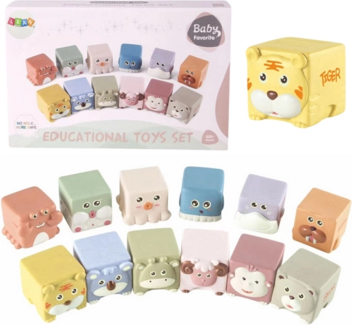 Dette sæt med 12 bløde klodser er designet til sikker og stimulerende leg for de mindste. Hver klods viser et andet dyr og tilbyder en unik overfladestruktur, der giver rige taktile stimuli. Børn udvikler naturligt øje-hånd-koordination, lærer at genkende former, farver og dyrenavne og øver samtidig grebet.