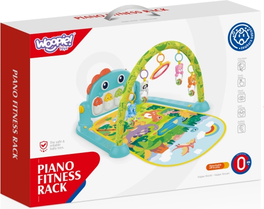 Baby legetæppe med bøjle Dino fra mærket Woopie er ideelt til børn fra fødslen. Dette legetæppe er udstyret med en bøjle med farverige dyrehæng, et spejl og skydende perler, som positivt påvirker udviklingen af alle babyens sanser. Det tilbyder et fantastisk sted til hvile, leg og udforskning af verden.