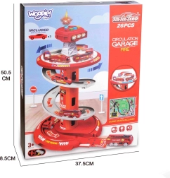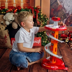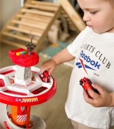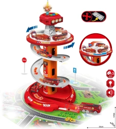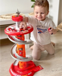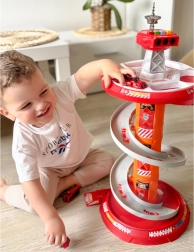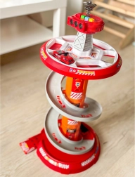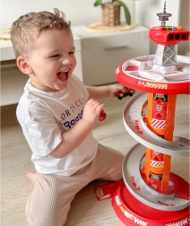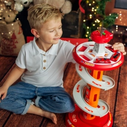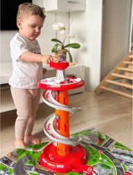 Sæt fart på legen med WOOPIE’s flerniveaus brandmandsparkeringshus! Det stabile tårn med en spiralrampe muliggør en jævn og hurtig nedkørsel fra toppen helt ned til basen. Børn træner finmotorik og fantasi, når de rykker ud ad den markerede udrykningsrute og følger færdselsskiltene.