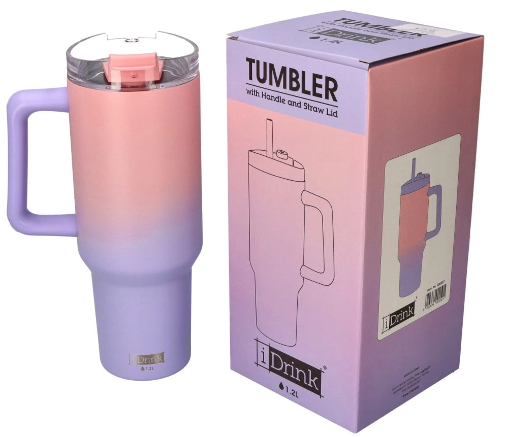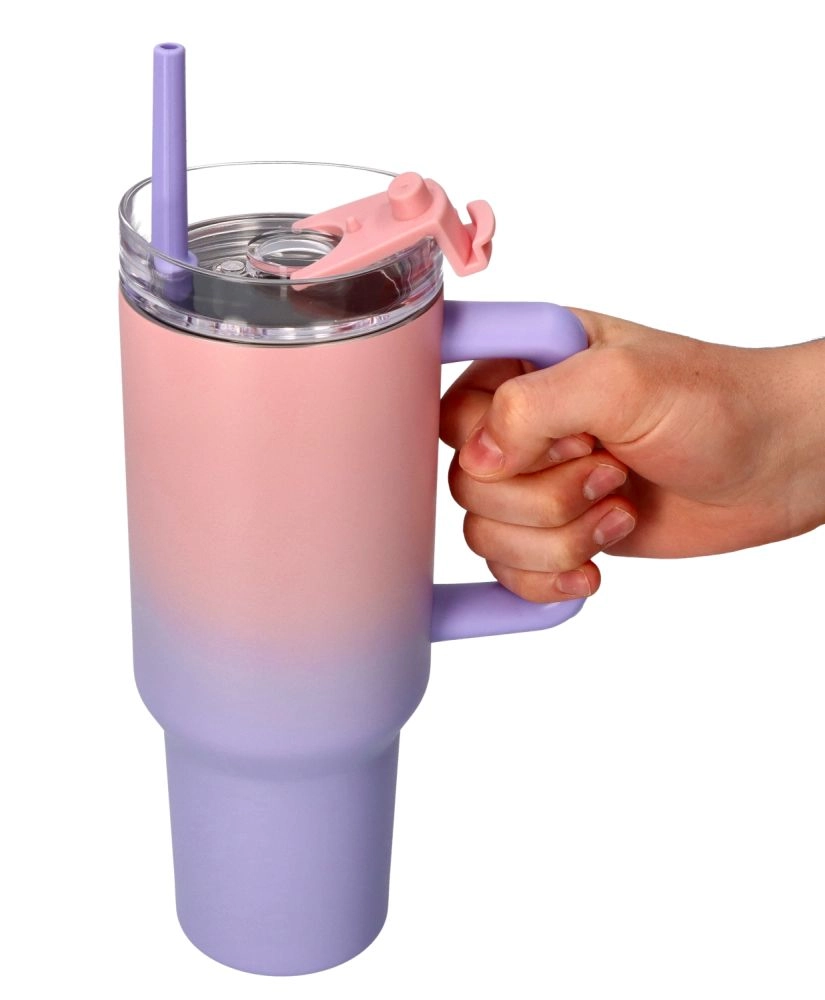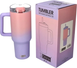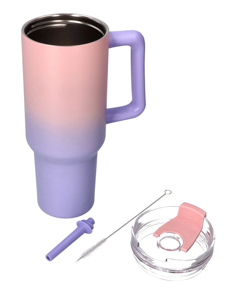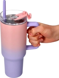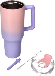 Oplev komforten ved en termokop med stor kapacitet, der kombinerer moderne look med praktiske detaljer. Den pastelfarvede overgang fra pink til lilla fanger øjet, mens det gennemsigtige låg med hul til sugerør og det behagelige håndtag gør daglig brug lettere både hjemme og på farten.