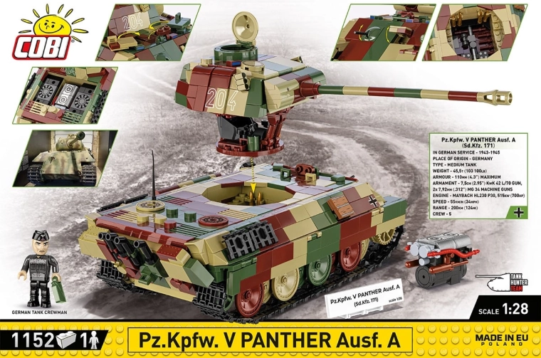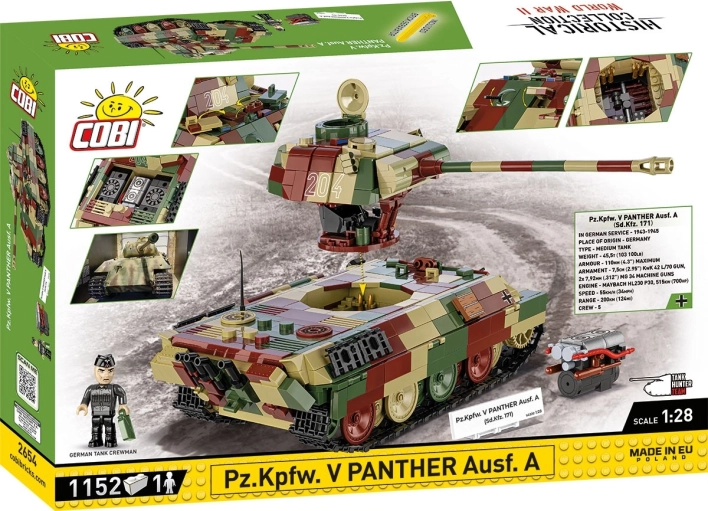 Vi præsenterer et gennemarbejdet byggesæt inspireret af den berømte Pz.Kpfw. V Panther Ausf. A (Sd.Kfz. 171) – et ikon fra Anden Verdenskrig. Modellen gengiver trofast originalens formsprog og proportioner, inklusive camouflagefarver. Takket være det drejelige tårn, den bevægelige kanon og de funktionelle bælter får du både realistisk udstilling og actionfyldt leg. Det aftagelige tårn giver adgang til et detaljeret interiør med en aftagelig motor og åbne luger.