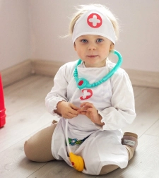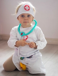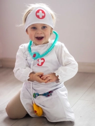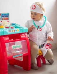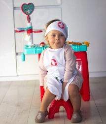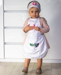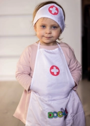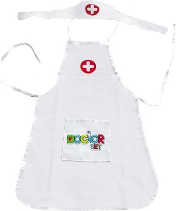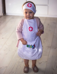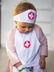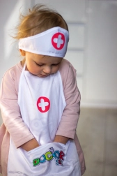 Let forklæde med praktiske lommer rummer stetoskop og andet børneudstyr, så lægelegen altid er lige ved hånden.