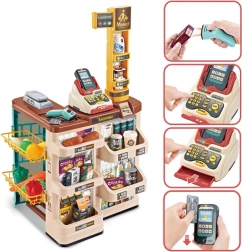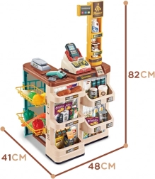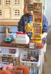 Den mekaniske vægt efterligner den ægte, og hyldeindretningen med prisskilte hjælper børn med at sortere, arrangere og lære om værdier.