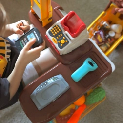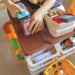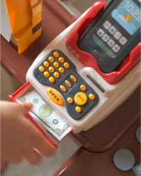 Kasseapparatet med udtræksskuffe til penge, kortlæser og en scanner, der lyser og laver lyd, giver børn en autentisk indkøbsoplevelse.