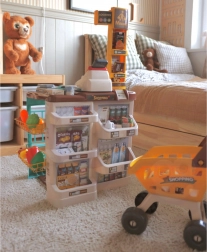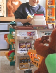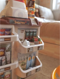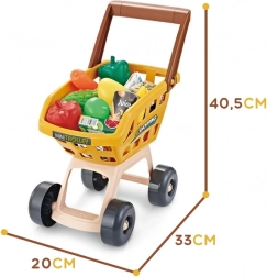 Der medfølger kurv/vogn og en række madvarer som frugt, grøntsager, mælk og juice – alt til fuldendt butikleg.