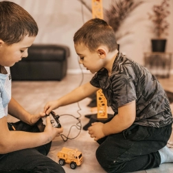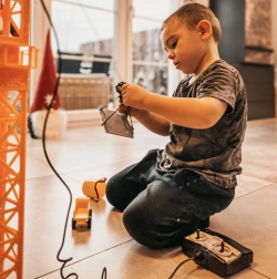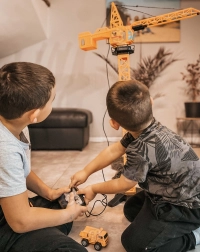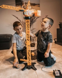 Kranen roterer fuldt rundt og gør det muligt at løfte, sænke og flytte laster langs bommen – præcis som på en rigtig byggeplads. Sjov leg og træning af koordination.