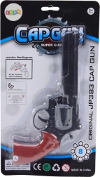 Oplev den klassiske kapselrevolver, som glæder både små og store westernfans. Takket være den drejende tromle virker den overbevisende og kan bruges med eller uden kapsler – som legetøj, rekvisit eller del af et kostume. Det sorte korpus med rød skæfte giver et autentisk udtryk og et behageligt greb.