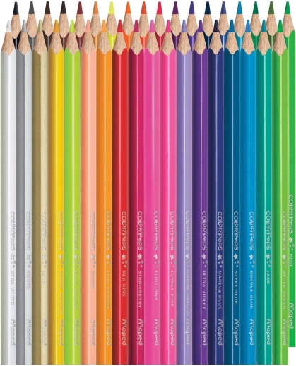 Sæt med 36 farveblyanter MAPED Color'Peps i et praktisk etui glæder både skoleelever og kreative voksne. De har ergonomisk trekantet krop, blød og holdbar stift samt klare, mættede farver, inklusive sølv, guld og 3 fluorescerende nuancer.