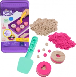 Oplev Kinetic Sands unikke tekstur og skab din egen lille konditori. Med kombinationen af pink og naturfarvet sand former du nemt “chokolade”- og “flødeskumslag”, og med de dobbeltsidede forme laver du et væld af former. Spartlen med mini-stempler hjælper med dekoration, og låget på boksen fungerer som serveringsfad.