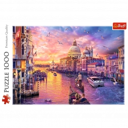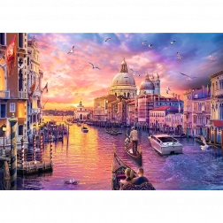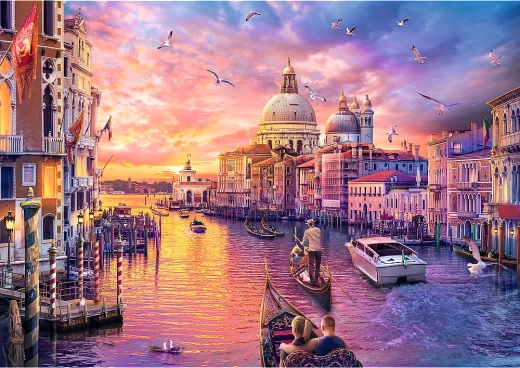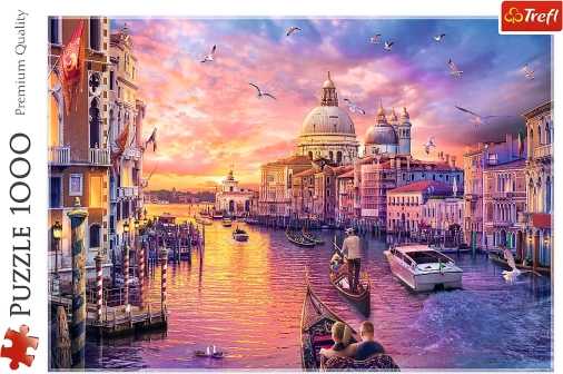 Find roen med en smuk scene af Venedigs Canal Grande i solnedgang. Puslespillet med 1000 brikker byder på levende farver, præcis stansning og solide brikker, der passer perfekt sammen. En ideel gave til både Venedig-elskere og erfarne puslere.