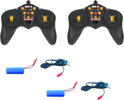 Begge maskiner har gummihjul for bedre trækkraft på forskellige overflader, lys styret fra fjernbetjeningen og en holdbar konstruktion. I pakken finder du også genopladelige batterier 3,7 V 500 mAh og USB-kabler til nem opladning, så legen kan begynde med det samme.