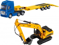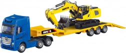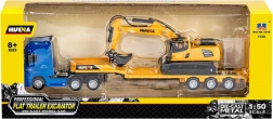 Metaltrækker med lavt læsser-anhænger og gravemaskine HUINA 1:50 gul