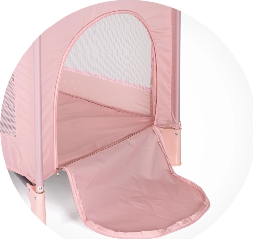 Takket være den hurtige sammenklapning og lette konstruktion tager du den nemt med på ferie, til bedsteforældrene eller bruger den som ekstra seng. Sideindgangen med lynlås gør det muligt for større børn at kravle ind selv. Plastbeskyttede kanter øger sikkerheden, og transporttasken beskytter sengen mod snavs under opbevaring og transport.