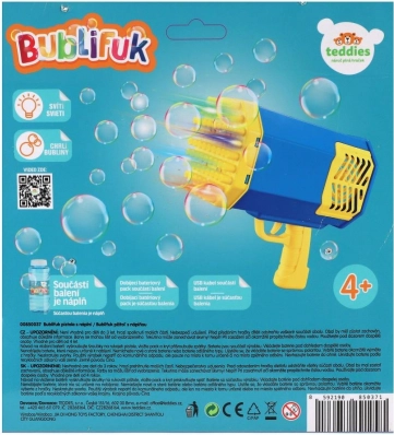 I pakken finder du et genopladeligt batteripack for nem brug uden konstant batteriskift samt en praktisk skål til væsken for hurtig dypning af hovedet. Det integrerede lys giver boblerne en effektfuld glans, især i skumringen.
