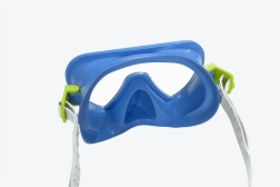 Den blå dykkermaske er udstyret med UV-beskyttende linser og en justerbar silikonerem, som sikrer komfort og sikkerhed under vandet.