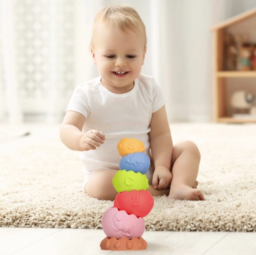 Denne multifunktionelle byggeleg med runde, teksturerede dele i blide pastelfarver er ideel til de første udforskninger og sorteringslege. Børn kan stable delene, gribe, klemme og undersøge relief-tal og -former og udvikler derved naturligt motoriske færdigheder og tidlig matematisk forståelse.