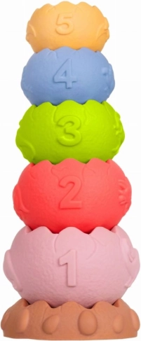 Pastelfarvede dele er lette at gribe og kan stables stabilt til et højt tårn. Børn træner hånd-øje-koordination og tålmodighed hver gang pyramiden bygges.