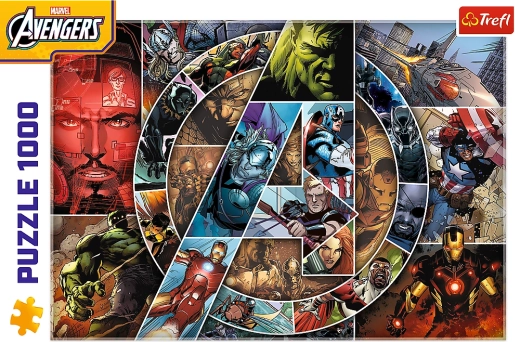 Puslespil med 1000 brikker med MARVEL AVENGERS-motiv. Størrelse 683 × 480 mm, kvalitets miljøvenlig udførelse og kalandreret papir for behagelig samling.