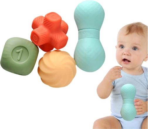 Takket være de unikke teksturer træner børn greb, klemning og flytning fra hånd til hånd og styrker hånd-øje-koordinationen. De farvede former kan bruges til at lære de første former, farver og tal – på en sjov måde og hver dag.