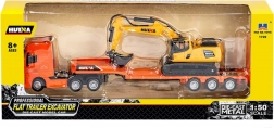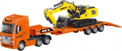 Lastbilmodellen med lavprofileret anhænger og gravemaskine er en præcis replika af et transportkøretøj designet til at transportere tungt byggeriudstyr. Lavet af kvalitetsmetal og robust ABS-plast, kombinerer denne model en solid konstruktion, holdbarhed og præcision.