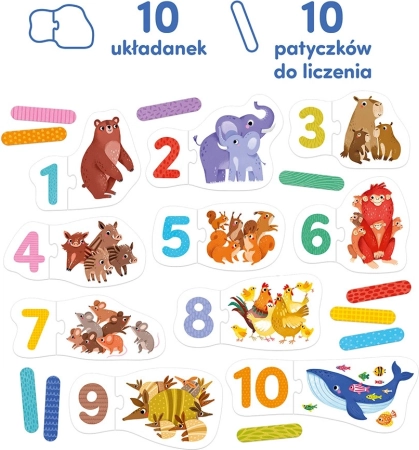 Opdag et sjovt læringssæt til førskolebørn: 10 store todelte puslespil og farvede regnestave hjælper børn med at lære tallene at kende og tælle til 10. Puslespil, der både underholder og lærer, udvikler finmotorik, opmærksomhed og logisk tænkning og motiverer til de første skridt i matematik.