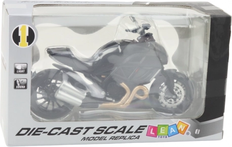 Den realistiske metalmodel af en sportsmotorcykel i skala 1:12 begejstrer både børn og samlere. Den byder på metalkonstruktion, detaljeret udførelse, lys- og lydeffekter samt funktionelle elementer som styrbare håndtag, affjedret ophæng og roterende hjul. Det elegante sorte design med gyldne accenter virker premium og ser fantastisk ud på hylden.