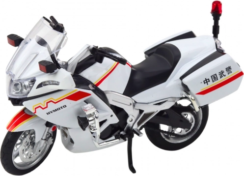 Oplev en detaljeret model af en motorcykel i hvidt med rød‑gule linjer, der trofast indfanger dynamikken i moderne éthjulede maskiner. Den metalliske krop i kombination med kvalitetsplast sikrer lang levetid, mens realistiske elementer som spejle og forlygter giver modellen et autentisk udseende.