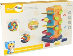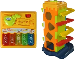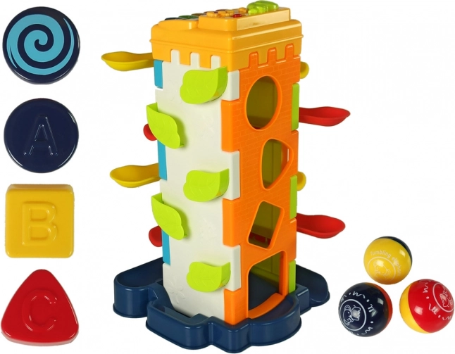 Denne smarte legeting motiverer børn til aktiv leg og udvikling af færdigheder. Smid kuglerne i det øverste hul og følg deres vej ned gennem etagerne. På sidevæggen finder børn sorteringsåbninger til forskellige former og på en anden side et mini-klaver til de første musikalske eksperimenter. Alt er lavet af sikker, certificeret plast med glatte, blødt afrundede kanter.