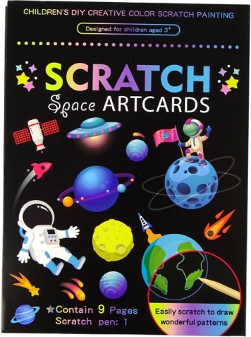 Skrabe-malebog for børn med rumtema: 9 billeder, træspatel, handy format. Fremmer kreativitet, CE- og EN71-certificeret, fra 3 år.