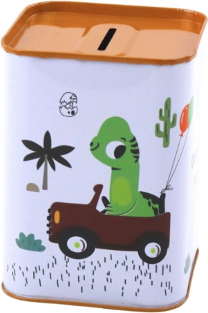 Glade illustrationer af en dinosaur i en bil og farverigt design gør sparebøssen til en smuk dekoration.