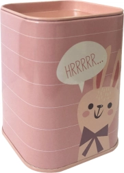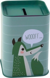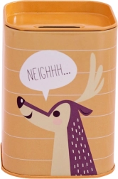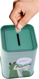 Støt børns finansielle vaner med stil. Sparebøssen i metal med dyremotiver tilbyder sikker opbevaring af småpenge, er let, praktisk og nem at vedligeholde takket være den glatte overflade. Dekorative striber og talebobler (fx “RAWRRR…”, “WOOOFF…”) giver et legende udtryk, som børn elsker.