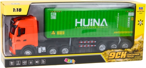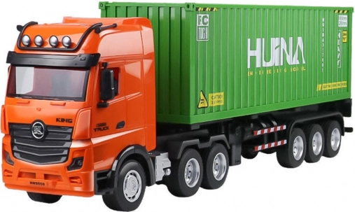 RC-lastbilen med container fra HUINA imponerer med præcise detaljer – førerkabine, spejle og funktionslys ser overbevisende ud. Den åbnelige container kan frakobles trækkeren, og udtrækkelige støtteben sikrer stabilitet under parkering. Slidstærk, børnesikker plast og gummidæk garanterer lang levetid og behagelig kørsel.