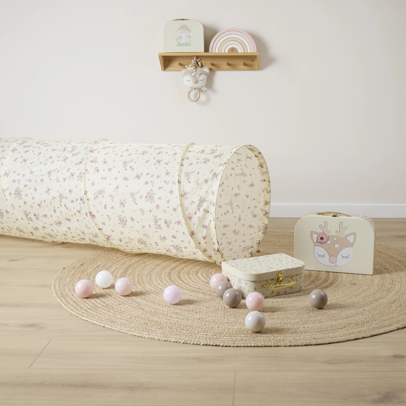 Denne tunnel er en del af Vintage flowers kollektionen, som bringer et elegant blomsterdesign til hvert børneværelse. Den er velegnet til indendørs brug og forvandler ethvert rum til et hyggeligt legeområde.