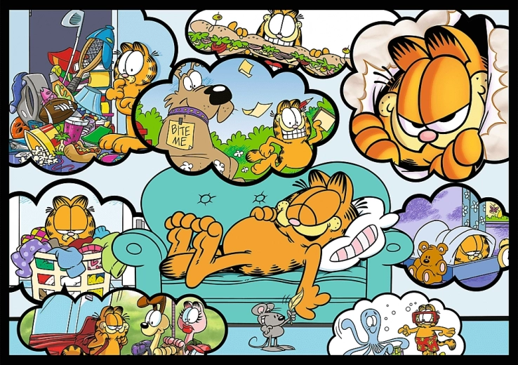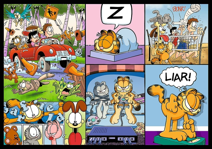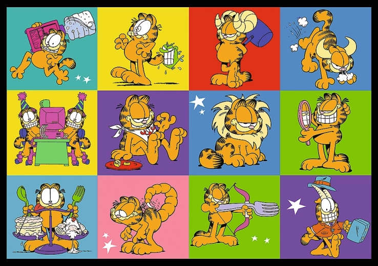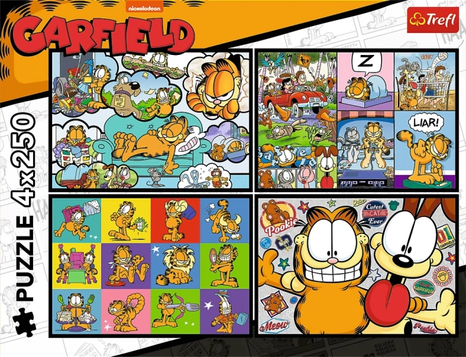 Opdag fire farverige illustrationer med den legendariske kat GARFIELD, hvis humor glæder både små og store. Hvert puslespil måler færdigsamlet cirka 33,9 × 23,9 cm, så de passer nemt på bord eller pusleunderlag. Med 250 brikker pr. motiv er de perfekte til let øvede puslere og til en familieeftermiddag.
