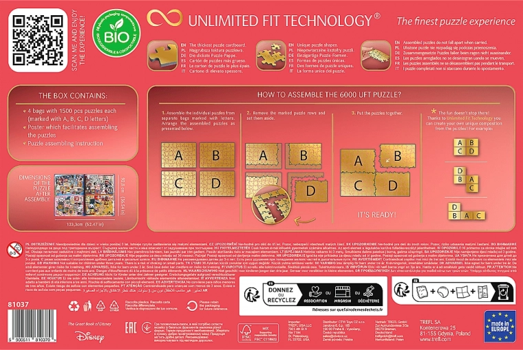 Saml den magiske DISNEY-verden med det unikke TREFL UFT-puslespil med i alt 6000 brikker. Pakken indeholder fire separate motiver med 1500 brikker hver, som du takket være Unlimited Fit Technology (UFT) kan forbinde frit til én stor komposition. Nyd tryk i højeste kvalitet, stærke blå kartonbrikker, nem flytning af samlede sektioner og økovenlig emballage uden plastfolie.