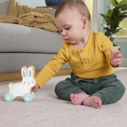 Denne charmerende kanin på hjul inspirerer de mindste til aktiv leg – fra de første berøringer og skub, mens de sidder, til at kravle og forfølge legetøjet hen over gulvet. Den kompakte form ligger godt i små hænder, og den jævne kørsel understøtter bevægelseskoordination og naturlig nysgerrighed.