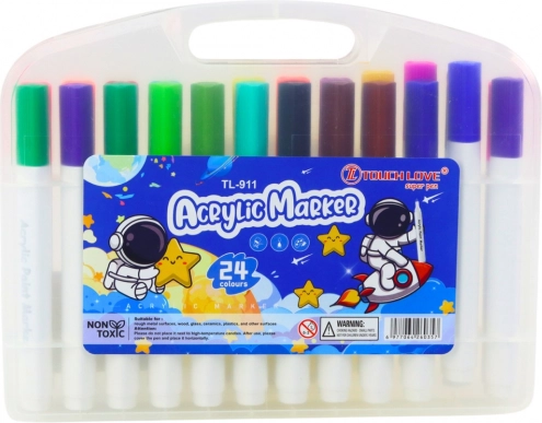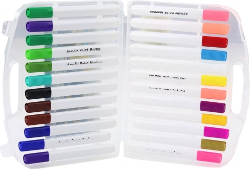 Sæt med akrylmarkere er et fremragende værktøj for alle, der elsker kunst, både børn og voksne. Den praktiske organizer i form af et bærbart etui gør det nemt at opbevare og transportere hele sættet, hvilket gør det ideelt til brug derhjemme, i skolen eller udendørs.