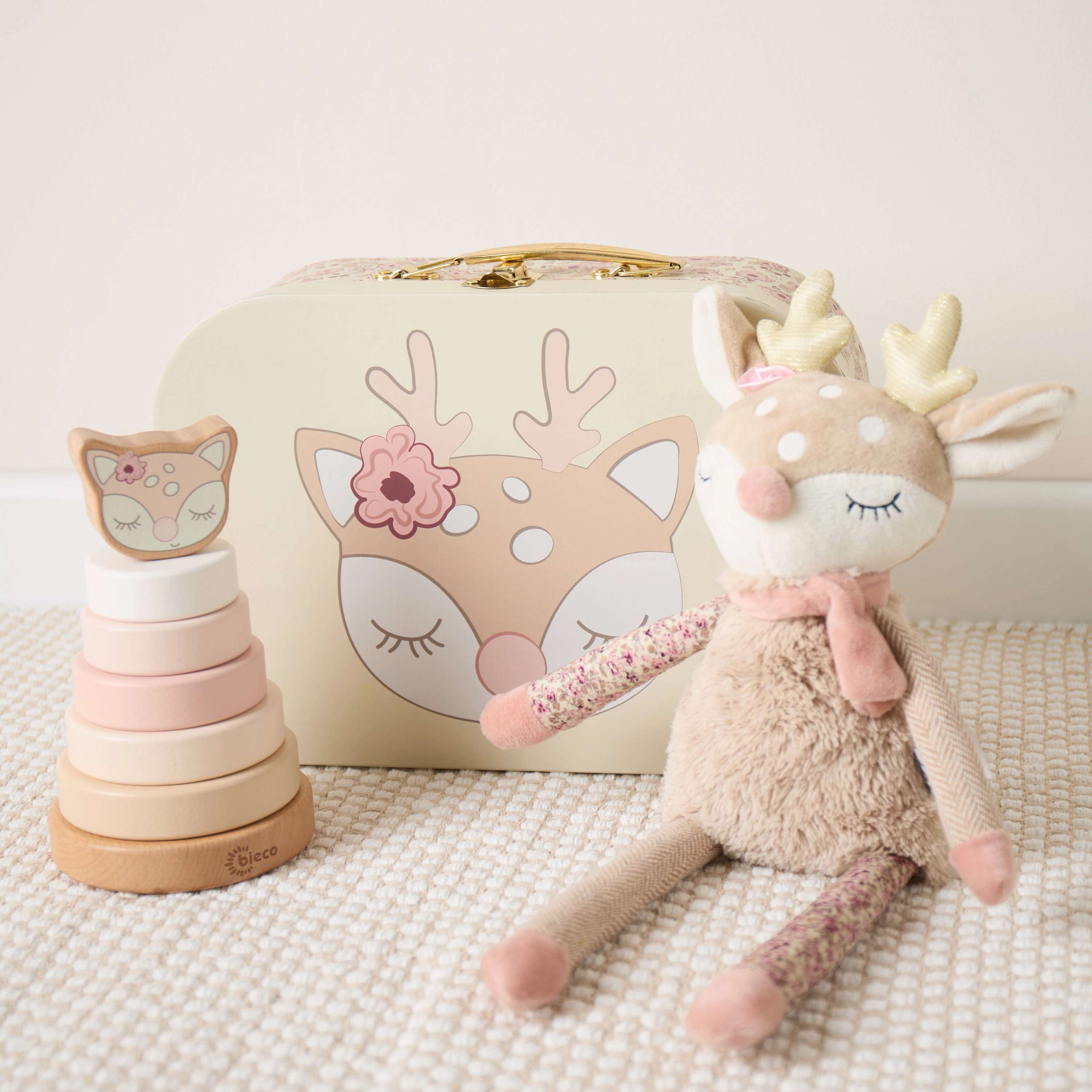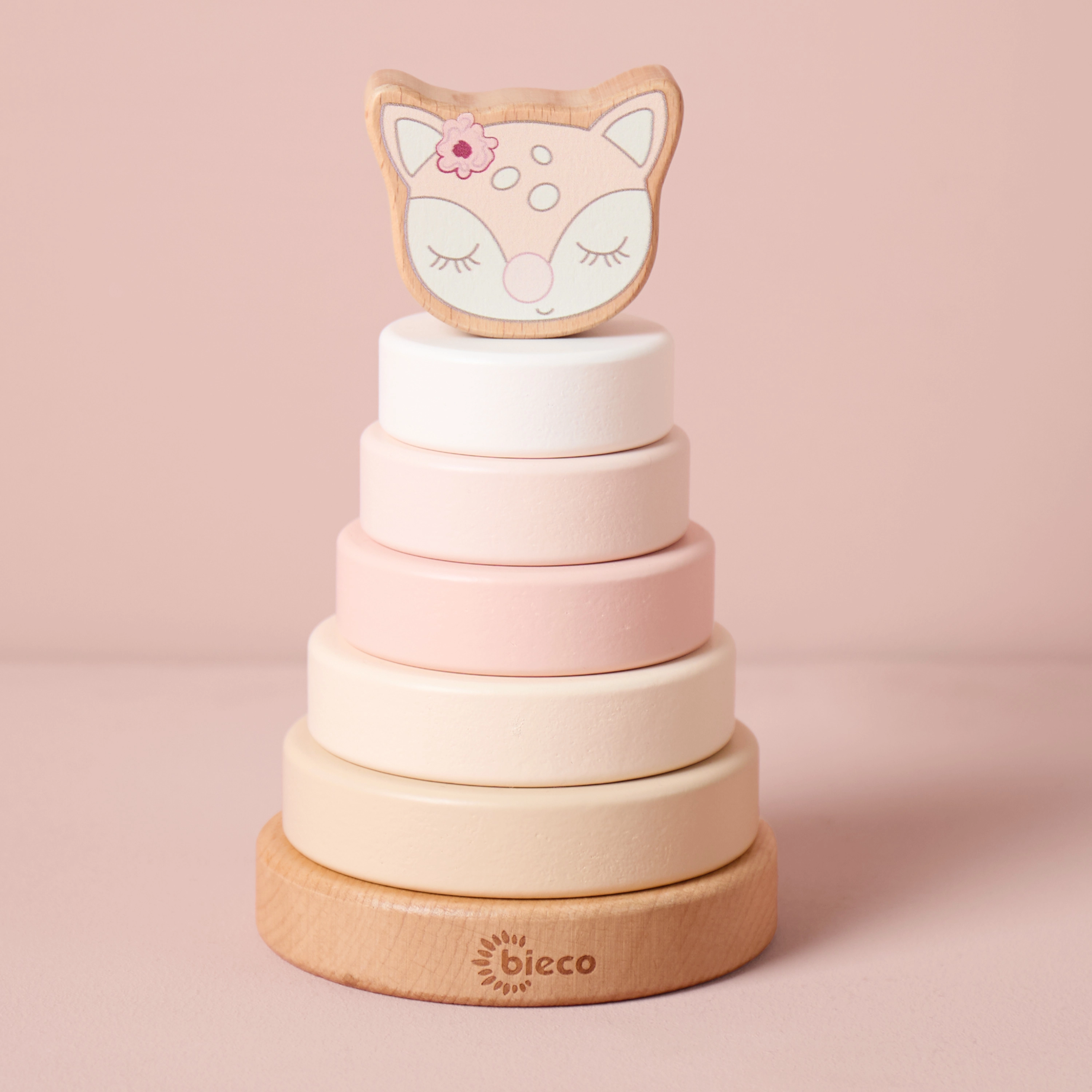 Det søde træstablingstårn med motiv af rådyrkalven Ella fra Bieco understøtter finmotorik, hånd‑øje‑koordination og læring af farver og størrelser. Seks lette ringe af kvalitets FSC-træ sættes på en sikker, fleksibel vippepind, der er fast forbundet med basen – for sikker leg fra 12 måneder.