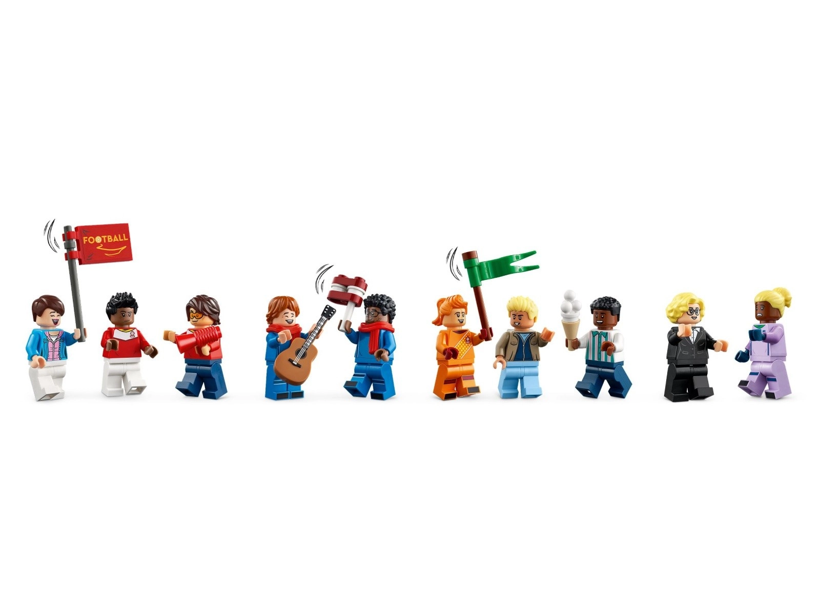 Der medfølger 15 minifigurer, som repræsenterer fodboldens mangfoldige verden – inklusive ikoner som Megan Rapinoe, Yuki Nagasato, Sam Kerr og Asisat Oshoala. Med det rige tilbehør kan du skabe en autentisk stadionstemning og nyde endeløse scenarier fra kickoff til trofæfejring.