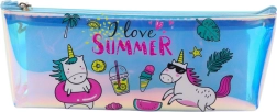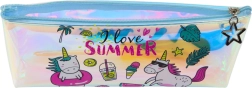 Pennalet har holografiske enhjørningemotiver og sommertilbehør med teksten 'I love SUMMER'.
