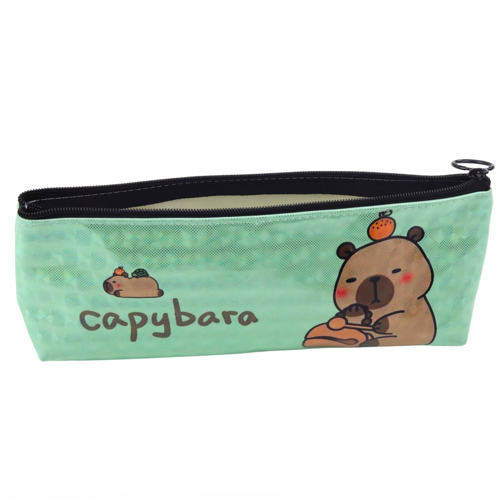 Stilfuldt skolepenalhus med kapybara-motiv i en smuk metallisk grøn farve – det ideelle tilbehør til enhver dyreelsker. Dette penalhus skiller sig ikke kun ud med sit moderne udseende, men også med sin praktiske anvendelighed.