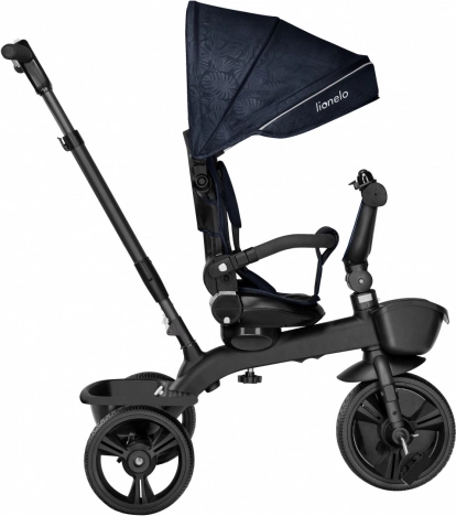 Den monocoque magnesiumramme er markant lettere end stål eller aluminium, men stadig stærk og dæmper naturligt vibrationer. Sikkerheden understreges af 3-punkts sele, blød bøjle, skridsikre håndtag, mulighed for hjulblokering ved parkering og overensstemmelse med EN 71. Den praktiske udrustning omfatter flaskeholder, to rummelige kurve og en lukbar taske til småting.