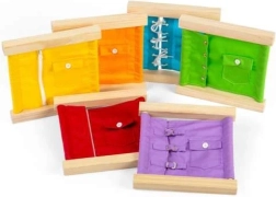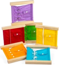 Dette læringssæt i klare farver er inspireret af Montessori-metoden og guider børn mod selvstændighed. På en sjov måde træner det øje–hånd-koordination, styrker tålmodighed, koncentration og evnen til at løse problemer. Hver ramme simulerer virkelige situationer ved påklædning.